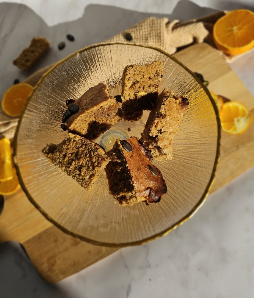 - Těsto vlijeme do formy vyložené pečicím papírem, posypeme dýňovými nebo slunečnicovými semínky a pečeme v troubě předehřáté na 180 °C (horkovzduch).