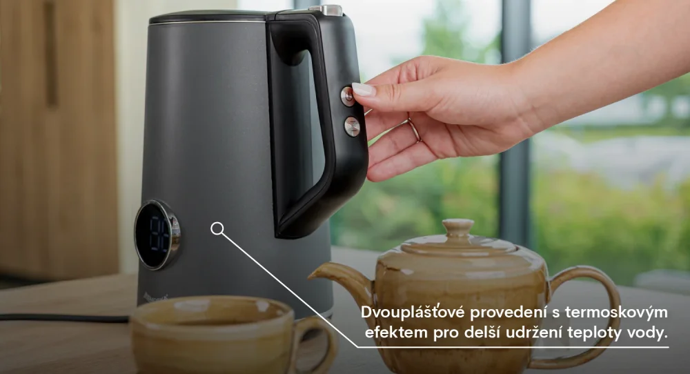 Dvouplášťové provedení s funkcí Cool Touch udržuje vnější část konvice chladnou, takže je bezpečná i při plném varu. Nerezové vnitřní tělo zajišťuje rychlý ohřev, odolnost proti vodnímu kameni a dlouhou životnost. Zároveň vytváří termoskový efekt, díky kterému voda vydrží déle teplá i po vypnutí konvice. Protiskluzové nožky pevně drží konvici na místě a automatické vypnutí ji chrání před přehřátím – pro váš klid a bezpečí každý den.