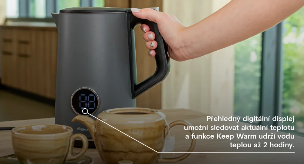 Rychlovarná konvice Remoska® Maria spojuje moderní design a chytré funkce. Díky možnosti nastavení teploty 50, 70, 90 nebo 100 °C si snadno připravíte čaj, kávu nebo jiný nápoj přesně tak, jak ho máte rádi. Přehledný digitální displej vám umožní sledovat aktuální teplotu a funkce Keep Warm udrží vodu teplou až 2 hodiny, takže si můžete dopřát další šálek, aniž byste museli znovu vařit.