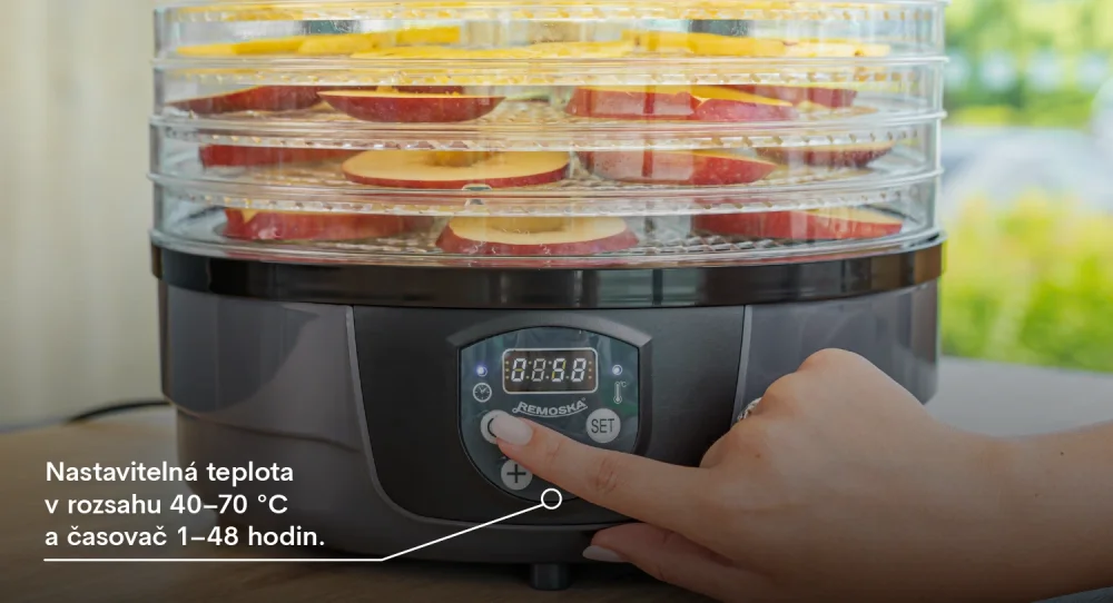 Díky nastavitelnému časovači (1–48 hodin) a teplotě (40–70 °C) dosáhnete se sušičkou potravin Remoska® Maria ideálních výsledků u všech druhů potravin – od jemných bylinek, přes šťavnaté ovoce až po maso. Velké sušící pláty o průměru 32 cm umožňují připravit větší množství pochoutek najednou, a velmi tichý provoz (≤55 dB) spolu s automatickým vypnutím zajišťuje bezpečnost a pohodlí i při nočním sušení.