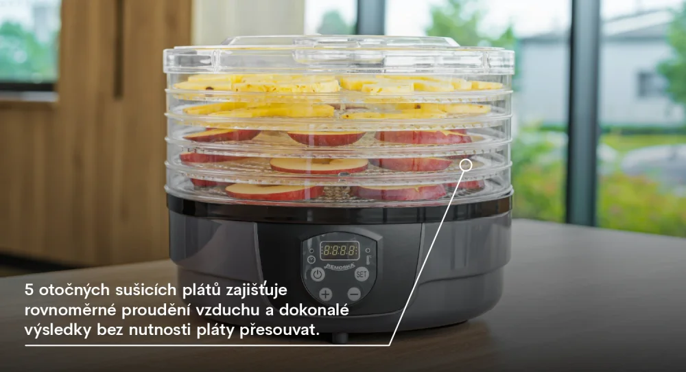 Sušička potravin Remoska® Maria je vybavena 5 sušicími pláty, které se během provozu otáčejí a zajišťují tak rovnoměrné proudění vzduchu. Kruhový tvar sušičky podporuje cirkulaci a výsledkem je dokonale vysušené ovoce, zelenina, maso, houby či bylinky bez nutnosti ručního střídání plátů.